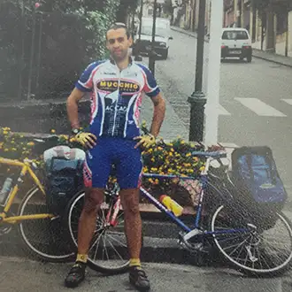 A 18 anni, sulle ali dell’entusiasmo generato da Pantani e dalle imprese a Giro e Tour di quell’anno, per festeggiare la maturità si regala con gli amici d’infanzia un primo viaggio in sella a una vecchia mountain bike in acciaio, scavalcando le colline tra Firenze e Assisi.