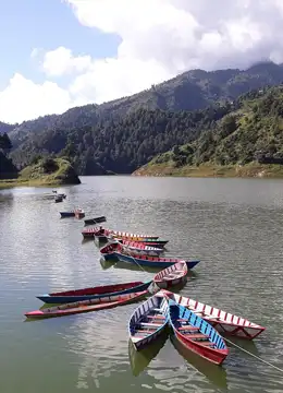 Un lago dalle acque smeraldine, immerso nel verde della foresta nepalese, con cascate e barche colorate a fare da pittoresca cornice al paesaggio