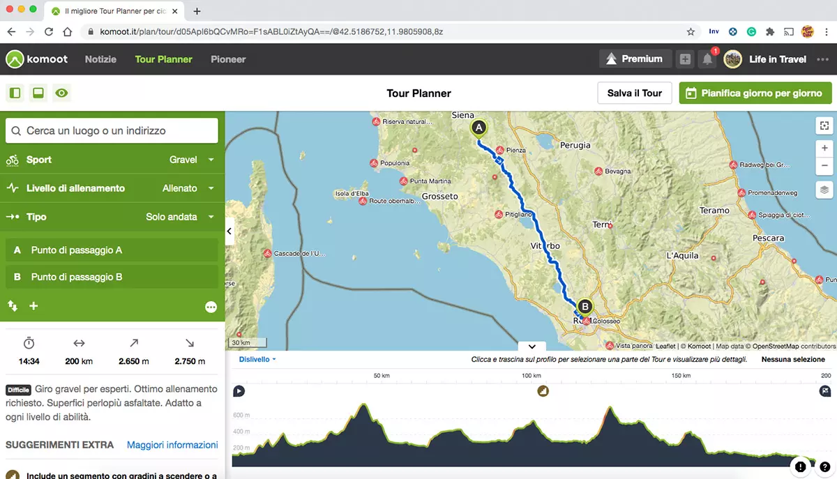 Ancora più sotto nella schermata si potranno selezionare il punto di partenza e il punto di arrivo. Una volta identificati una partenza e un arrivo, sulla mappa a destra dello schermo apparirà la traccia suggerita. Ad esempio, se scegliessi un itinerario di viaggio (gravel) da Buonconvento a Roma, komoot mi indicherà come punto A la città di Buonconvento e come punto B la città di Roma.