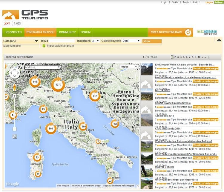 Anche questo portale contiene moltissimi dati e itinerari MTB. Gli itinerari possono essere ricercati sulla mappa, tra i più recenti o tra i più belli. Sì può selezionare i propri itinerari preferiti e visualizzare i dati sintetici del tour nella pagina iniziale.