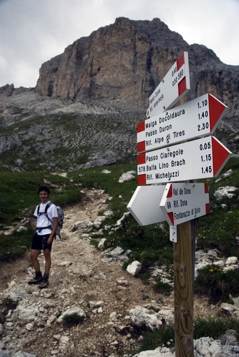 Seguendo il consiglio dell'addetta dell'ufficio turistico, parcheggiamo l'auto poco avanti sotto il ponte dove è libero. Da qui seguiamo la strada verso sinistra e, non appena oltrepassato un ponte, svoltiamo a sinistra nuovamente lungo una strada che sale. Poco più avanti incontriamo il cartello indicante il luogo di sosta del taxi che conduce al rifugio Micheluzzi a 1850 m: sono solo 400 m di dislivello, ma usufruire di questo servizio ci farebbe risparmiare almeno un'ora di tempo, nonostante il costo decisamente eccessivo di 8€!