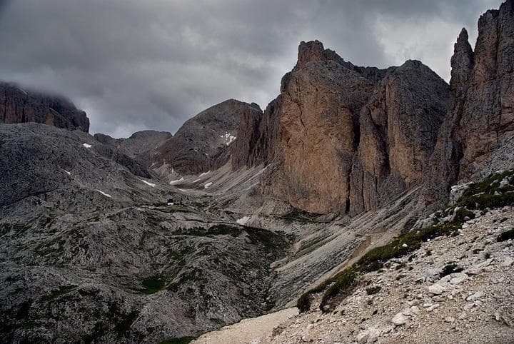 Nonostante qualche tratto molto esposto, per chi ha esperienza in montagna, la salita non risulterà particolarmente difficile, ma non la consiglio a chi si approccia per le prime volte a questi splendidi paesaggi, come del resto non suggerirei l'intero giro affrontato per l'impegno e la lunghezza del tracciato, oltre che per certi passaggi particolarmente esposti. Dalla cima torniamo poi indietro verso il Rifugio Passo Principe, ristrutturato di recente, situato in un'ottima posizione. Il snetiero 584 taglia poi la montagna scendendo rapidamente verso il Rifugio Vajolet e Preuss a 2248m. Il cielo ci concede un pomeriggio variabile che risulta sufficiente per scorgere le vette che ci sovrastano da ogni lato. Dal Vajolet, la traccia n° 546 porta in meno di mezzora ai sottostanti punti di appoggio per escursionisti: Rifugio Stella Alpina, Gardeccia e Catinaccio. Siamo esausti ed optiamo per usufruire del carissimo servizio navetta fino a Pera o Pozza di Fassa (5€ solo andata, 8,5€ andata e ritorno). Dal parcheggio della funivia di Pera di Fassa, tentiamo un autostop di fortuna, Nicola non ha la meglio per sei macchine, mentre io al primo colpo trovo un passaggio di due simpatici locali della Val di Fassa fino a Campitello.