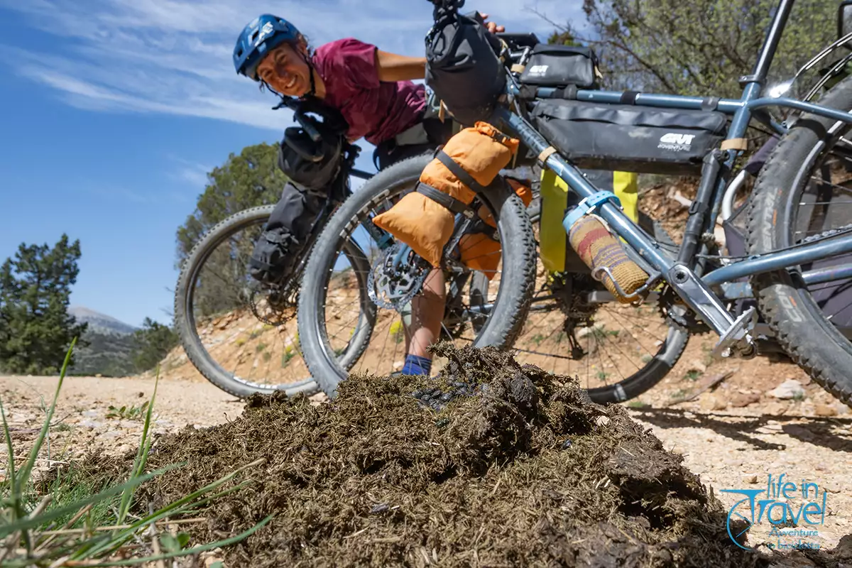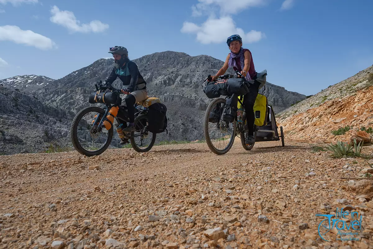 Ci sediamo nel giardino della vicina moschea per mangiare pane e olive prima di riprendere la salita, durissima, verso l'ennesimo scollinamento. Ancora gravel, ancora spinta per brevi tratti, ancora panorami vasti e aperti con monti rocciosi e innevati a chiuderli da lontano. Una nuova discesa fino a valle ci riporta sul letto di un fiume che seguiamo per cinque o sei chilometri prima di ritrovare la terra e pendenze impegnative.
