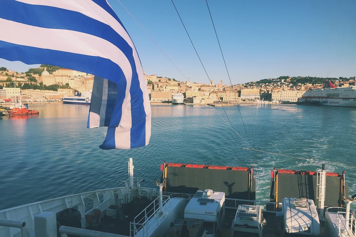 Per raggiungere il Peloponeso in bicicletta, e più precisamente Patrasso, città di partenza e arrivo del nostro tour ad anello della penisola greca, abbiamo viaggiato in nave da Ancona con la compagnia Anek Lines, che consente il trasporto gratuito della bici e in un tempo piuttosto ragionevole (e decisamente poetico) permette di raggiungere il porto greco in una giornata di navigazione. Ovviamente si potrebbe anche volare, ma ciò comporterebbe l'inscatolamento della bici, e a dirla tutta, per raggiungere la Grecia, abbiamo preferito optare per il traghetto.