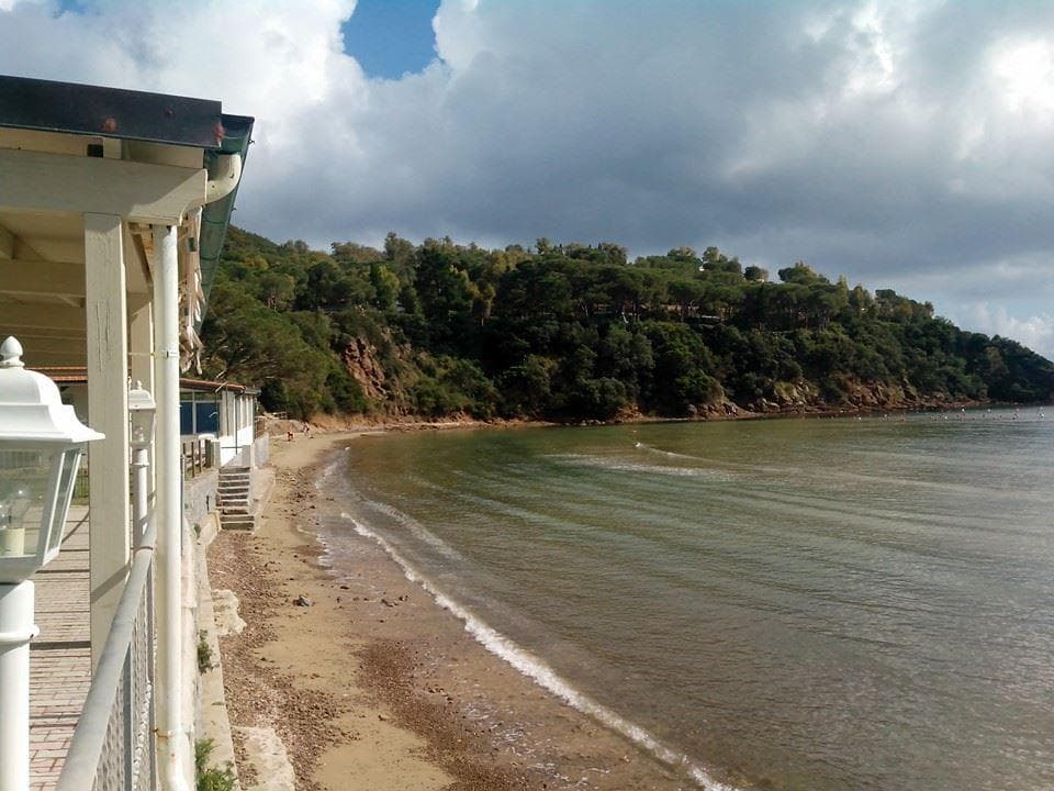 Mi viene data la camera e la bicicletta trova sistemazione nell'ufficio dove mi sono registrato. La piazzetta di Procchio alla sera offre uno spettacolo di villeggianti che si rilassano e mangiano seduti ai tavoli dei bar e ristoranti. Ceno e mi ritiro in stanza per la notte e al mattino presto mi preparo a scendere e partire. Prima di ripartire chiacchiero con le signore dell'albergo che oltretutto mi danno alcune utili indicazioni sul giro che mi accingo a compiere. Prima tappa è la spiaggia sotto l'albergo che è un litorale sabbioso racchiuso tra due ali di roccia. In mezzo alla baia staziona un brigantino a due alberi che mi ricorda di non perdere la rievocazione storica in occasione del bicentenario di Napoleone che qui ha vissuto per molto tempo. Prima destinazione è Marciana Marina, che raggiungo velocemente su una strada ombreggiata che come il giorno prima stupisce per la magnificenza della vegetazione. Su un cartellone pubblicitario leggo che c'è un traghetto che dispone di una galleria vetrata sommersa che effettua il giro dei fondali a nord dell'isola, ripromettendomi di tornarci per fare diving senza bagnarmi.