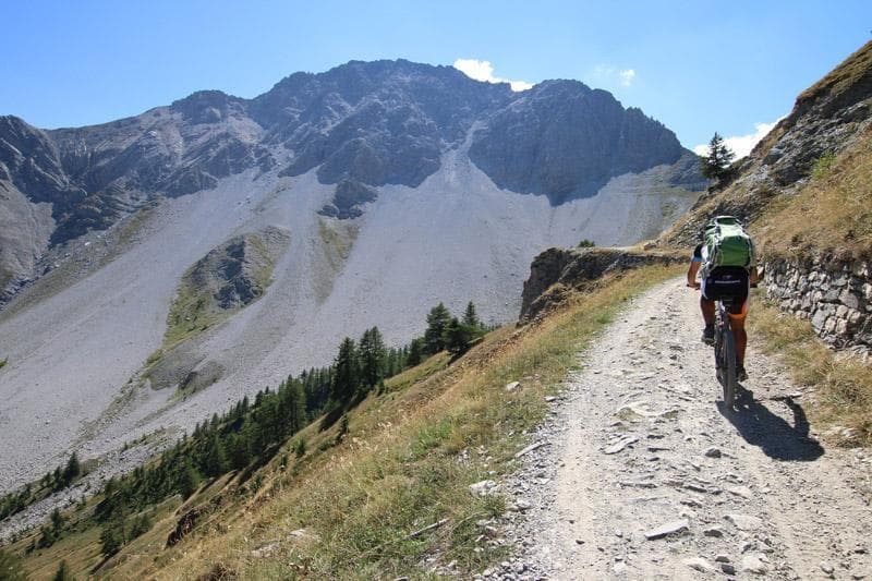 Le mountain bike ruggiscono, si inarcano sotto la nostra spinta ma non demordono e dopo una decina di chilometri di salita incontriamo il bivio verso Punta Colomion. Non fatevi sfuggire l'occasione di salire al parcheggio appena sopra la strada (a destra) prima di proseguire sulla sinistra verso il passo della Mulattiera: il panorama che vi si aprirà davanti agli occhi vi lascerà a bocca aperta. Scorci spettacolari svelano cime come la Pierre Menue (3505 m) lungo la valle che conduce al Colle del Sommeiller e la dorsale dolomitica tra Rocca Bernauda e punta Quattro Sorelle. Ben riconoscibile inoltre la Guglia Rossa che domina l'imbocco della val Stretta.