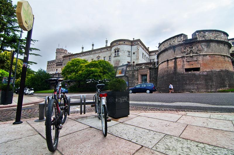 Il punto di partenza dell'itinerario non può essere più comodo. L'Hotel America di Trento, attrezzato per ospitare ciclisti e cicloturisti, si trova a due pedalate dal centro storico. Dirigendo le ruote della bici verso nord, si affronta un suggestivo passaggio per ritrovarsi in via del Suffragio, già in zona a traffico limitato e quindi fuori dalla confusione di altre arterie cittadine. Si costeggiano i portici della via ed al bivio successivo si imbocca via S. Marco a sinistra, per sbucare proprio di fronte al castello del Buonconsiglio, in piazza Mostra, dopo l'ennesima svolta a sinistra. La maestosa residenza dei principi Vescovi è spesso sede di interessanti mostre temporanee oltre a presentare magnifici affreschi ed è visitabile tutti i giorni tranne i lunedì non festivi dalle 10 alle 18 nel periodo estivo. Se vi volete fermare, trovate una piccola rastrelliera per le bici proprio al termine di via S. Marco,ad un centinaio di metri dall'ingresso del Castello.