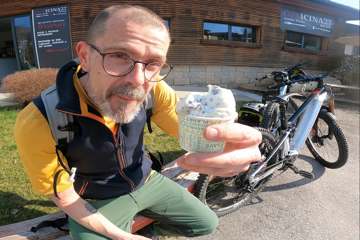 Il sentiero esce sulla strada provinciale con un ponte che attraversa il rio Maggiore. Noi seguiamo la via che costeggia il torrentello per entrare nel centro di Levico e proseguire ancora in discesa fino al viale d'ingresso a Levico dove ritroviamo la ciclabile. Ci togliamo lo sfizio di un gelato prima di chiudere quest'anello divertente sulle pendici della Panarotta, in MTB tra Levico e Vetriolo Terme.